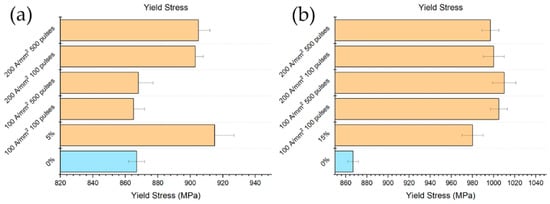 The yield stress, in the case of 5% prestrain, was higher in comparison both to that of the reference and the electropulsed specimens, as expected. A substantial reduction was observed for the specimens electropulsed with lower current density, while a very low or even no reduction was measured with higher current density (Figure 13a). Unexpectedly yield stress increased in the case of the samples prestrained at 15% and electropulsed, even in comparison to the reference value (Figure 13b).