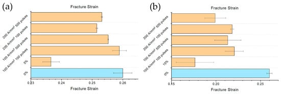 In the case of the specimen prestrained at 5% fracture strain did not show any trend (Figure 15a). As said before, the treatment at lower current density and lower number of pulses showed a fracture strain comparable to that of the reference specimen. The fracture strain of the specimens treated at 200 A/mm2, even if it was higher compared to the prestrained material, was slightly inferior to that of the 100 A/mm2 treatment, regardless of the number of pulses. It is clear from Figure 15b that, in the case of 15% prestrained specimens, the number of pulses affected in more extent the fracture strain rather than the current density. EPTs conducted with lower number of pulses showed the same increase in fracture strain. The most severe electropulsing treatment (200 A/mm2 500 pulses) increased fracture strain in comparison to the prestrained material but was the worst in terms of absolute increase in fracture strain. It is worth noting the generally high scattering of the data regarding the test conducted on the specimens prestrained at 15%.