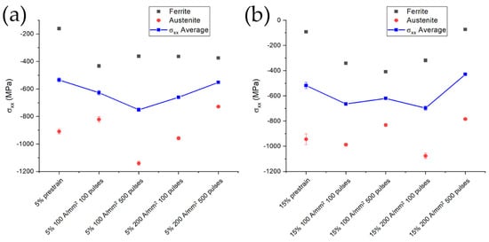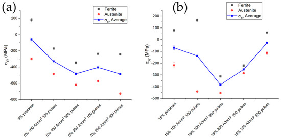 The average transverse residual stresses for both degrees of prestrain showed almost the same values (Figure 16). Since tensile test introduces uniaxial stress configuration in the specimen, no variation in the average residual internal stresses was expected. On the other hand, electropulsing treatments have shown to induce changes in the grain orientation within the materials not to mention the change in morphology of secondary low conductivity phases (i.e., cementite particles in perlite) hence, a change in the residual stresses of the single phase was expected [30,50,51,52,53]. An increase in compression stress amounts in ferrite after the first electropulsing treatment was determined and this did not change even after the electropulsing treatment at higher current density and higher number of pulses (Figure 16a). In the case of the specimens prestrained at 15%, again an increase of the compressive state in ferrite (approximately from −50 MPa to −400 MPa) was determined for the lower current density treated samples. The higher current density treatment produced a decrease of the compressive stresses in ferrite from −400 MPa to almost the same value as the prestrained material (Figure 16b). The compressive state in austenite was much severe in comparison to that in ferrite (Figure 16a) but no significant trend have been observed. Same considerations can be made in the case of the material prestrained at 15% (Figure 16b). On the other hand, the average residual stresses in both cases remained almost constant.