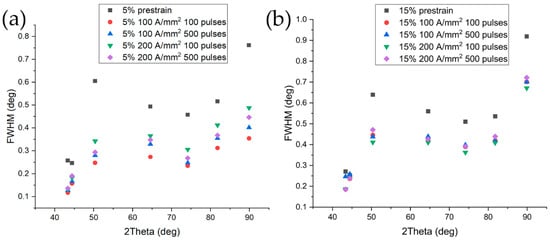 FWHM of the electropulsed specimens prestrained at (a) 5% and (b) 15%.