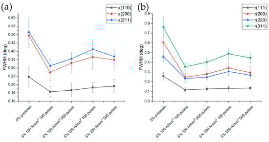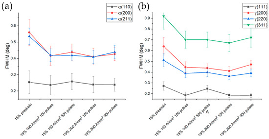 As expected from the tensile test curves, the most significant decrease in FWHM of the 5% prestrained samples, was observed in the case of the treatments that showed the highest recovery in fracture strain (100 pulses at 100 A/mm2 in Figure 19). A slight increase in FWHM was observed with the other electropulsed treatment, with a subsequent reduction for the electropulsing treatment at higher current density and number of pulses. It is interesting to note the higher reduction in terms of absolute values for the FWHM relative to the austenitic phase, due to its higher dislocation density in the as strained condition because of the low yield point and higher work hardening rate compared to ferrite.