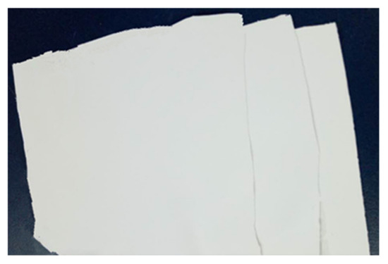 Bifunctional sheets were prepared according to the above methods. When a low mass ratio of CA to TiO2 (0.04:1) was used, it was unable to prepare uniform sheets and the sheets broke to pieces easily. As the mass ratio increased to 0.045:1, the adhesion degree between CA and TiO2 improves, but the sheets were still easy to crack. Using higher CA to TiO2 mass ratios of 0.05:1, 0.06:1, and 0.065:1, the sheets formed a uniform, white, shiny monolithic laminar material as shown in Figure 2.