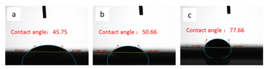 The dynamic contact angle of the sheets was tested by an Attension C-201 (Attension C-201, Biolin Scientific, Gothenburg, Sweden) optical contact angle tester [27]. The specific operation steps were as follows: i) the sample was fixed on the test platform; ii) the droplets were dripped from the needle of the syringe onto the surface of the sample, and the dynamic value of the contact angle was read out by the instrument through rapid photography. The liquid used in the contact angle measurement was deionized water, and the amount of water in the needle was 3 µL when measured.