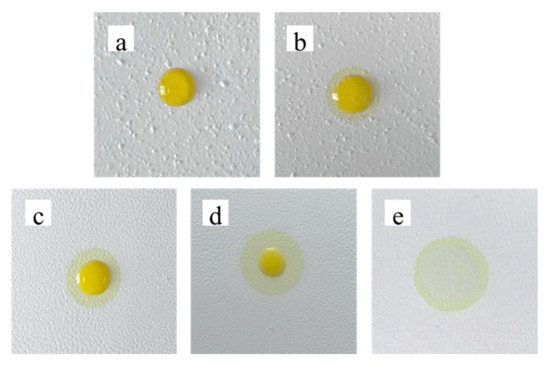 To investigate the dispersion effect of the TiO2 bifunctional sheets, 10 µL serum was added to sheets prepared at different mixing times of 30 min, 2 h, 3 h, 4 h, and 5 h, respectively. As shown in Figure 6, after 10 s of diffusion, the serum could hardly diffuse on the surface of the 30 min-stirred sheets. The diffusion ability of the TiO2 sheets prepared with 2 h stirring was slightly improved. The residual liquid on the surface decreased, but the diffusion effect was still not ideal. The serum diffused fast without any residue on the surface of sheets prepared with 5 h stirring.