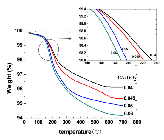 The thermal analysis results of the CA/TiO2 hybrid sheets are illustrated in Figure 7. The decomposition temperature decreased as the mass ratio of CA to TiO2 increased because TiO2 has better thermal stability than CA. It can be seen that the content of CA had an influence on the thermal stability of the sheets [28]. The sheets are used at room temperature or 37 °C, so it does not affect the application of the sheets.
