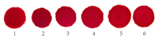 Figure 10 shows that the color of the reaction spots obtained on the reagent sheet were uniform, thus confirming that the serum diffused evenly. In addition, the areas of the six spots formed after the reaction was similar. The SD of the diameter of the six spots was 0.04, which illustrates that the sheets had good diffusion repeatability for the serum. Table 2 outlines the results for the dry chemical reagent color spots tested using reflected light density testing. The relative deviation of the light reflection signal value of the six groups ranged within ±0.028%, which illustrates that the dry chemical reagent has good reproducibility. Therefore, using the same reagent sheet for the same batch, the sheets had good serum diffusivity and an excellent repeatability.