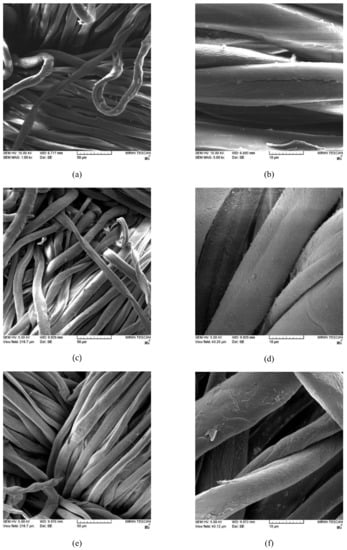 It is clearly evident that chitosan forms an uneven layer on the surface of cotton fiber (Figure 2a,b), but after the first and fifth washing cycle agglomerates of chitosan particles are still present on the fibers surface, suggesting that chitosan particles were grafted onto the surface of cotton fabric (Figure 2c–f).