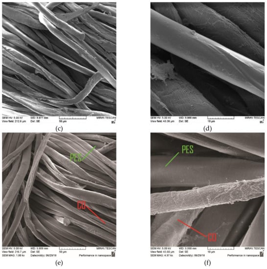 From the SEM images of PES/CO fabric, the difference in morphology of fibers in the blend can be clearly seen: CO fibers’ morphological structure show the appearance of a flat ribbon with a central canal in comparison to the PES even flat smooth surface.