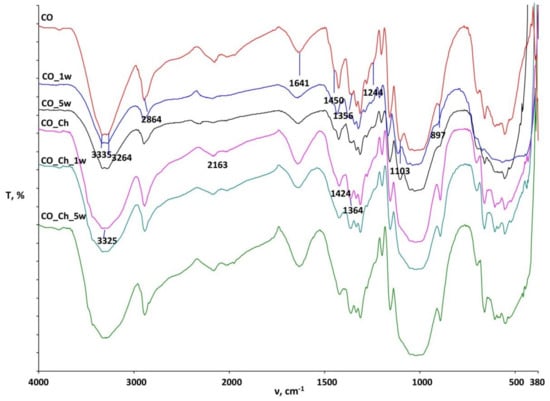 Lower or missing peak at 1105 cm−1 and 1425 cm−1, as well as increased intensity at 895 cm−1, are characteristic for mercerized cotton [36,43]. Since the chitosan implementation was performed in 20% NaOH, and mercerization occurred, the disappearance of the peak at 1103 cm−1 is confirmation of change the cellulose crystal structure from cellulose I to cellulose II. The peak at 897 cm−1 resulting from vibrations within C-H can be attributed to both cellulose II and chitosan (Figure 7, peak 894 cm−1). The increment of intensity can be result of its overlapping. The changes in the appearance of the peak at 1424 cm−1, due to the symmetric bending of the CH2 bond at the C-6 atom, indicate the presence of chitosan in the cellulose structure, because for mercerized cellulose II is characteristic decreased intensity of this peak. The clear peak at 1424 cm−1 in the bands of chitosan treated cotton fabrics (CO_Ch, CO_Ch_1w, and CO_Ch_5w), confirms the persistent physico-chemical modifications of the cellulosic material by chitosan particles.