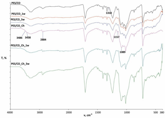 Peaks on 1310 cm−1 (C-H wagging) and 1157 cm−1 (C-O-C asymmetric stretching) become weaker and broader, most probably due to covering and reaction chitosan with the PES/CO fabric. A very interesting change is seen in the area of 1157 cm−1 (C-O-C asymmetric stretching), where the peak completely disappears after finishing, and the reappears after the first washing cycle in a very small intensity indicating constant changes in the fabric. All of the mentioned changes in the treated fabric are also visible after the five washing cycles, which indicates a permanent change in the physico-chemical properties of the treated PES/CO fabrics [44,45,46,47].