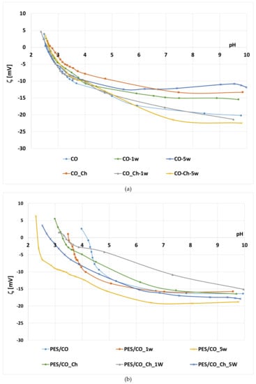When comparing the zeta potential results of CO and PES/CO fabrics to fabrics with implemented chitosan after the washing cycles, it can be seen that a certain amount of chitosan is still present in the fabric, because, at pH 4, the zeta potential values are higher. For example, at pH 4, the zeta potential of PES/CO_1w is ζ = −9.8 mV, and PES/CO_Ch_1w is ζ = −2.8 mV; and, after five cycles the zeta potential of PES/CO_5w is ζ = −12.3 mV and PES/CO_Ch_5w is ζ = −7.8 mV.