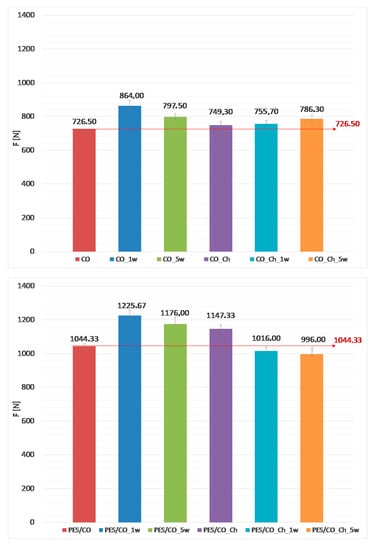 The mechanical properties of CO and PES/CO fabrics after chitosan implementation and the washing process were analyzed through the tensile properties and mechanical damage (wear). Figure 9 presents the results of average breaking force with interval of confidence of 99% (IC99%). The mechanical damage was calculated from these results according to ISO 4312:1989. The results are presented in Table 3 with regard to the washing process, and, in regard to start fabric, the certain pair was compared.