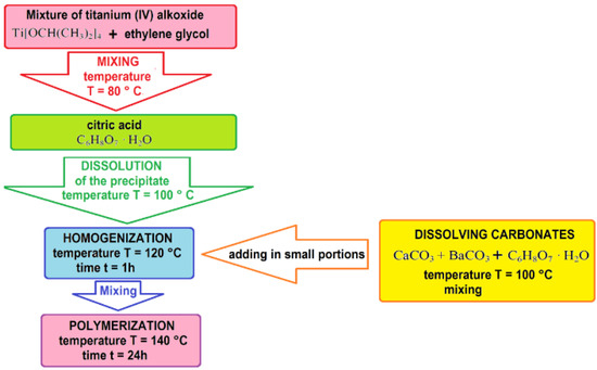 The starting materials used for the modified Pechini method synthesis of BCT were barium and calcium carbonate powders (BaCO3, CaCO3) and a solution of titanium (IV) isopropoxide Ti[OCH(CH3)2]4. The applied technology chart is presented in Figure 1.