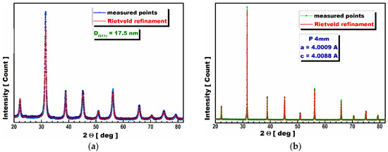 Generally, the lattice constants and grain size, which are directly dependent on the obtained ceramic nano-powder’s particle sizes and sintering conditions, have been shown to be very important in terms of optimizing the piezoelectric properties of BCT materials [5,6,7]. There are very few scientific reports on the synthesis of BCT ceramics using the Pechini method [8,9,10].