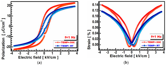Figure 4b presents the piezoelectric strain for the BCT samples. As large a strain as d = 0.14% was recorded under an electrical field as low as 4 kV/cm at a temperature of −50 °C. Additionally, a very small hysteresis is shown in Figure 4b for a large strain that can achieve an almost perfect structure with low ferroelectric domain pinning. The same parameter value recorded at room temperature (RT) is d = 0.14%, which is also extremely high for this particular composition [19].