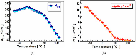 Piezoelectric coefficient vs. temperature measurement for the BCT at a temperature range from −70 to 100 °C (a); (b) polarization vs. temperature at a temperature range from −70 to 100 °C.