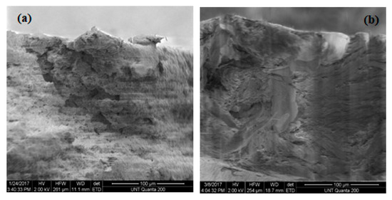 In the last three figures, (a) represents films without UV exposure, (b) represents films after 3 weeks’ exposure, and (c) represents films after 6 weeks exposure. For pure PP samples we can see, at first, a compact fiber-like structure—which becomes more granular-like at 6 weeks. Seeing stone-like microstructures of pure PP, we recall decrease with time of values of the tensile elongation at break. Samples with 0.5 wt.% HALS2 show A fiber-like microstructure for all periods of time. Nano-ZnO-containing samples show granular structures at all periods of time.