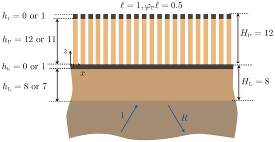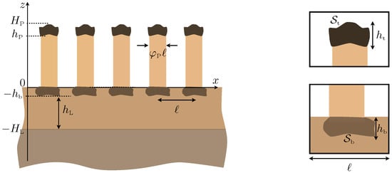 - Geometrical parameters: the layer has a total height with occupied by the heterogeneities. The array of plates is periodic with spacing ℓ, with plate thickness and total height ( occupied by the heterogeneities). The heterogeneities at the bottom and top of the plates have surfaces and .