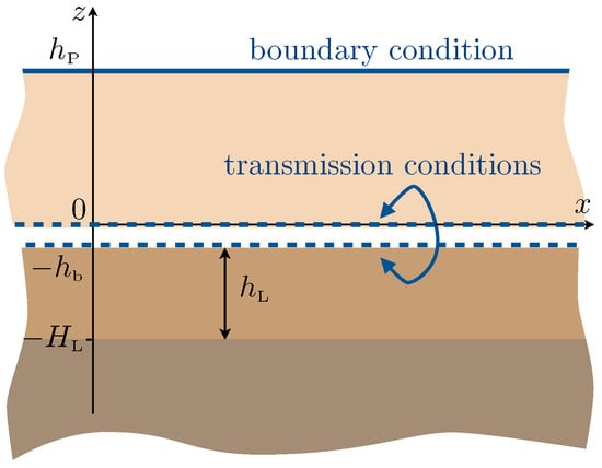 The transmission conditions involve and , being the jump of u across the bottom heterogeneity and its mean value, respectively, and the same for .