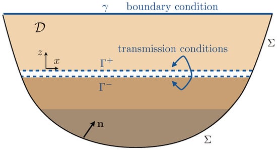 where is the normal interior and the parts of occupied by the substrate, the layer, and the plates, respectively. We have used that on from (2) and (3). We also have that ; hence, . The two terms in cancel after integration by parts of one of them, and we integrate also by parts the term in . It is worth noting that the integrations by parts make boundary terms (b.t.) appear. These terms can be interpreted as concentrated forces at the ending points of along x; they are disregarded in the present study. Next, in (10) are energies since they are definite positive quadratic forms. Indeed, from (5) and from (5), and it is shown in Appendix B that and are positive as well. It is also worth mentioning that choosing a different position for would produce a different and possibly negative value of . Similarly, expressing the transmission conditions across a zero thickness interface would produce a possibly negative value of . Discussions on the effective energies can be found in [31,32].