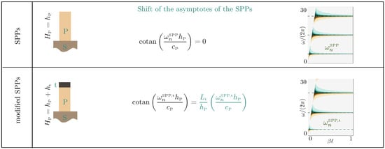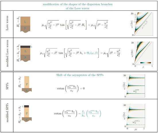 This is already visible for the undecorated plates (Case 1); the guided waves tend to resemble the classical Love waves, but they experience several hybridizations at the cut-off frequencies of the SPPs in (17), accompanied by avoided crossings (sometimes not so pronounced). In the presence of the caps on the top of the plates, the same scenario is observed, with now cut-off frequencies given by the modified SPPs in (18). Eventually, Cases 3 and 4 with the thin hard bottom layer reproduce the same sequence as Cases 1 and 2 with the guided waves, which tend to resemble the modified Love waves.