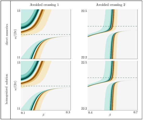Dispersion relations of guided waves in four configurations of plates from direct numerics and from the homogenized solution (20)–(22); the dispersion relations are revealed by large values. The exact reference dispersion relations of classical and modified Love waves are given in the top panel for comparison. Dotted lines are a guide for the eye showing light lines for Love waves and asymptotes for SPPs. AC1 and AC2 are avoided crossings magnified in Figure 8. Details of homogenized coefficients and geometrical parameters are given in Table 2 and Table 3.