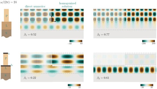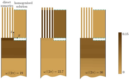 Eventually, we report in Figure 9 examples of the displacement fields of the guided wave at for the arrays of undecorated plates and of decorated plates. Both in the numerics and in the homogenized problem (19), the whole solutions were divided by and R respectively in order to produce an evanescent wave in the substrate of the form that has the unitary amplitude at . This allows for quantitative comparison between the direct numerics and the homogenized solution without any adjustable parameter, see Table 2. The agreement in the strengths of the resonances and in the repartition of the amplitudes in the substrate, in the layer, and in the plates is again excellent. At the reported frequency, the wave is evanescent in the substrate as soon as , and it becomes evanescent in the layer for ; this is visible for the undecorated plates for the guided waves with , which is supported by the array only.