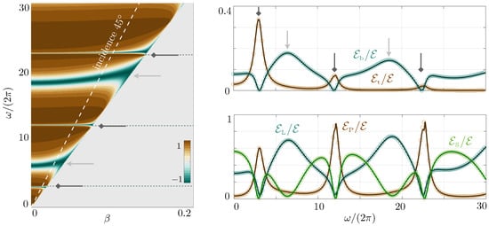 Left: Real part of the reflexion coefficient in colorscale against and . The dashed white line corresponds to an incident propagating wave at oblique incidence with . Right: Repartition of the energies in the bottom and top heterogeneities (upper panel) and in the substrate, layer, and plate (normalized with the total energy); see the lower panel. Open symbols are obtained from direct numerics, Equations (24), and plain lines from the homogenized problem, Equations (26) and (27).