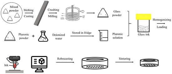 The glass inks for direct ink writing were prepared by following several successive steps, as depicted in Figure 1. Before preparing glass inks, Pluronic F-127 (Sigma-Aldrich, Darmstadt, Germany) was dissolved into deionized water with concentrations of 10 wt.%, 20 wt.%, 30 wt.%, 40 wt.%, and 50 wt.%, respectively. The mass of the chemicals was weighed in a high-accuracy (0.0001 g) weighing scale. All the polymer solutions were kept in hermetic containers to prevent water evaporation, and stored in a fridge (~4 °C) overnight, in order to further homogenize the composition.