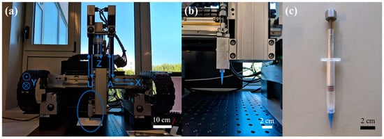 Facility of direct ink writing: (a) the Robocasting machine, (b) enlarged parts (left syringe chamber) as labelled in (a), and (c) a 3 mL syringe with a 410 μm nozzle.