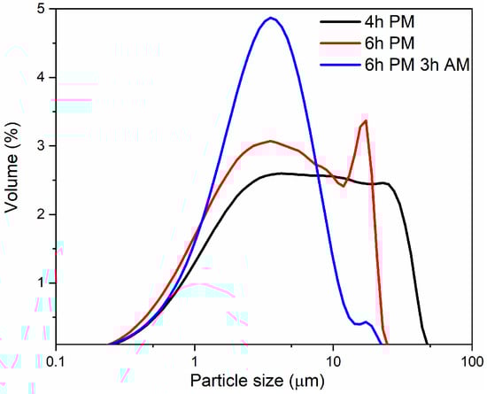 Particle size distributions of glass powders after different time of milling. Black line (4 h PM) corresponds powder milled in planetary mill for 4 h, green line (6 h PM) corresponds to 6 h of planetary milling (PM), blue line (6 h PM, 3 h AM) corresponds to powder obtained after 6 h of planetary milling followed by 3 h of attrition milling (AM).