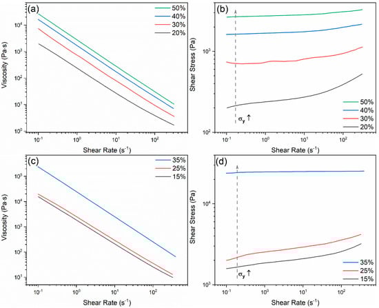 Another advantage of using Pluronic hydrogel, which does not involve the addition of processing additive solutions inevitably causing a diluting effect, is the ease with which the required solids volume fraction can be accurately adjusted and controlled. Pluronic solutions with five different concentrations were prepared. They can readily liquify at a low temperature and jellify again when placed at room temperature [28]. The solution with 10 wt.% Pluronic is able to flow even at room temperature, thus being improper for further glass ink gelation and printing, which is why it was not tested on rheometer. Figure 4 depicts the results of flow curves measured for both pure Pluronic solutions and glass inks. With an increasing the concentration, the viscosity of the Pluronic solutions and of the glass inks increases from 2 × 103 Pa·s to 3 × 104 Pa·s at a low shear rate of 10−1 s−1; and from 2 × 104 Pa·s to 3 × 105 Pa·s at 10−1 s−1, respectively, as shown in Figure 4a,c. The shear rate–shear stress curves (Figure 4b,d) reveal that the curves become flatter with increasing concentrations of both Pluronic and glass in the inks, as a mechanically percolating and space filling network is developed, which is characteristic of a solid-like material. The yield stress (σy) can be calculated by extrapolating the steady-state flow curve to zero shear rate [29]. The higher concentration of the solutions/suspensions will increase the yield stress. In the real printing process, it reflects the shear stress/strain applied in the syringe to start the flow of the gelled solutions/suspensions.