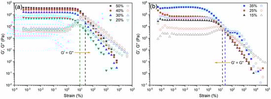 Linear viscoelastic region (LVR) of (a) Pluronic solutions and (b) glass inks measured under amplitude sweep mode. The elastic modulus (G′) and viscous modulus (G″), independently plotted in the same axis, are labelled as solid dots and empty symbols, respectively.