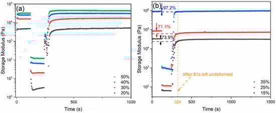 As mentioned above, the common dispersant–thickener–coagulant system is not applicable for 3D printing, owing to the insufficient stiffness of the as-printed layers for supporting the weight of the consecutive layers. The reason for this phenomenon is to account for the lack of ability to fast recover the gelled structure from the deformed state observed in the common ink system. In Figure 6, in order to analyze the change of the internal structure, the thixotropic behavior of both Pluronic solutions and glass inks is characterized in terms of the viscoelastic moduli by means of the three interval thixotropy test (3ITT) [31,32,33,34]. According to the results in Figure 5, where the shear strain spans from linear region to non-linear region, the input shear strain signal was chosen as 0.005% and 500%, respectively. For Pluronic solutions, in the first deformation step within the linear viscoelastic region (LVR), the G′ values are constant, which simulates that the structure is stable when the solutions/inks are not compressed. Then, the deformation enters into the non-linear region, as G′ immediately decreases, owing to the breakdown of the internal structure of the solutions/inks, simulating the printing process when the solutions/inks are under pressure. Subsequently, when the shear strain decreases back again to 0.005%, G′ gradually increases, as the internal structure recovers to the original gelled one when left standing, depicting the structural change in the as-printed filaments when attached to the substrate. The results from Pluronic solutions show good recovering ability, as G′ can reach 100% after sheared in the non-linear region. The glass inks inherit this excellent recovery behaviour from the Pluronic solutions, where G′ can rebuild up to 73.9%, 71.1%, and 97.2% after being sheared under 500% and the structure is left undeformed for 81 s, in terms of the increasing solids-loadings of the ink. When the solids-loading is 35 wt.% in the glass ink, it can even recover faster than the ones with the common dispersant–thickener–coagulant system reported previously [27].