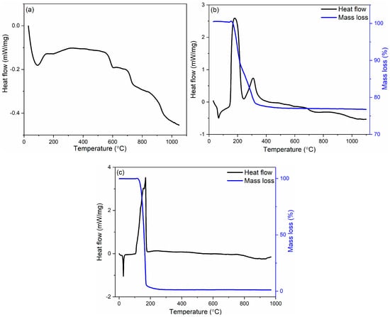 Differential scanning calorimetry coupled with thermogravimetry (DSC/TG) curves of borosilicate glass (a), printed sample (b), and pure Pluronic F-127 (c).