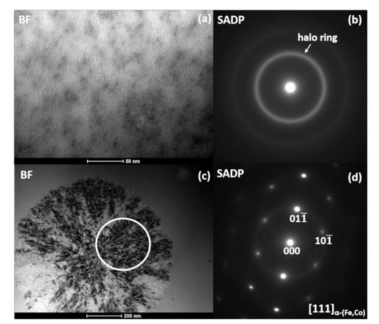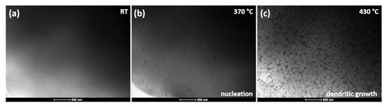 The in situ TEM experiments were performed with two heating rates of 20 and 200 °C/min to compare and recreate conditions typically employed during the experimental heat treatment. During the in situ TEM experiments, carried out with a heating rate of 200 °C/min, the evolution of microstructure was observed (Figure 4a). At 375 °C, in consistence with the DSC scan, the crystallization nuclei were revealed, followed by the dendritic growth of crystals (430 °C). The same phenomenon was reported in [23] for Fe85-xCoxB15 alloys for x within the range of 12 < x < 25 at.%. The presence of the crystallized nuclei at this low temperature was associated with a phase separation taking place within the amorphous matrix. This led to the formation of a dendritic α-(Fe,Co) structure, whereas the majority of the sample volume remained in its amorphous state.