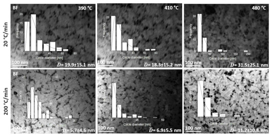 Figure 6 shows a set of microstructures in the BF mode recorded for different temperatures during in situ heating at 20 and 200 °C/min. Histograms of crystallite size distribution and their average values are attached to individual images of microstructures. The histograms have been fitted by a lognormal function similarly, like in the case of rapid annealed Fe-Si-Nb-B-Cu soft magnetic amorphous alloys [13]. From Figure 6, one can see that in both cases, the same crystallization mechanism occurs, including nucleation and dendritic growth. However, the crystallite size for samples heated at 20 °C/min is three times larger than the crystal size of samples heated at 200 °C/min for the same measurement temperatures. In addition, by analyzing the nature of the histograms, it can be concluded that in the first case (20 °C/min), a bimodal crystallite size distribution occurs at all temperatures. In contrast, for the second case at temperatures of 410 °C and 480 °C, unimodal normal type distribution occurs. In summary, it can be stated that the crystallization process of amorphous Fe67Co20B13 ribbons at 20 and 200 °C/min heating rates carried out by in situ TEM leads to visibly different microstructures in respect of the particular size and distribution of the crystalline phase, which in turn leads to various magnetic properties.