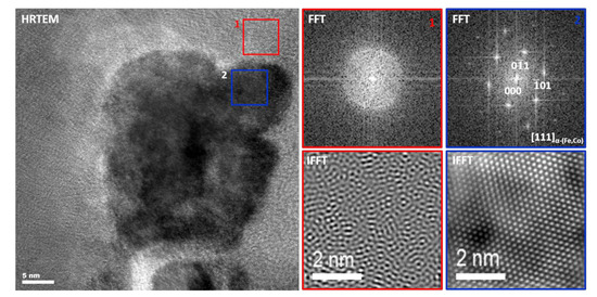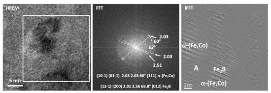 Figure 7 shows the HREM image together with the corresponding FFT and IFFT images of the sample heated in situ to a temperature of 500 °C with a heating rate of 200 °C/min. Reflections corresponding to interplanar distances such as 2.51 and 2.03 Å, as well as diffusion rings corresponding to the amorphous phase, are well visible on the FFT image taken from the marked area (white square). According to the angle’s measurement, the presence of α-(Fe,Co) and (Fe,Co)2B phases with the [111] and [012] zone axes may be confirmed, respectively. Accordingly, the IFFT’s two nano regions corresponding to the α-(Fe,Co) and Fe2B phases separated by the amorphous phase can be distinguished (Figure 7 right image).
