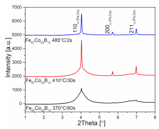 Figure 8 presents the synchrotron X-ray diffraction patterns of heat-treated ribbons. Samples after annealing show a two-phase structure consisting of both amorphous and α-(Fe,Co) crystalline phases. Moreover, the amount of crystalline α-(Fe,Co) phase calculated from X-ray diffraction patterns is found to be 6.5%, 38.7%, and 91.6% for ribbons annealed at 370, 410, and 485 °C, respectively. It is therefore clear that the higher the heat treatment temperature is, the greater the crystalline to amorphous phase ratio.