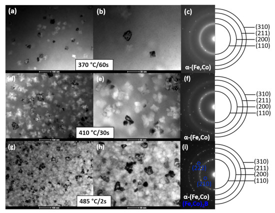 Set of BF images and corresponding SADPs for Fe67Co20B13 ribbons heat-treated under various conditions: 370 °C/60 s (a), (b), (c), 410 °C/30 s (d), I, (f), and 485 °C/2 s (g), (h), (i).