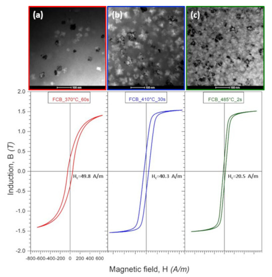 Figure 11 presents B-H (where B is induction and H is a magnetic field) loops of heat-treated Fe67Co20B13 ribbons in the correlation with microstructural features apparent in BF images. The coercivity (Hc) considerably diminishes with the increase of heat treatment temperature from 49.8 A/m for Ribbon 1 to 20.5 A/m for Ribbon 3. This behavior is a consequence of microstructure evolution, including both α-(Fe,Co) crystallite sizes and their volume fraction as well as the distribution in the amorphous matrix. In the case of the ribbon annealed at a temperature of 370 °C for 60 s, slightly below the onset of α-(Fe,Co) phase crystallization peak (Figure 1b), the crystallites are the largest (53 nm), unevenly embedded in the matrix. Here, the α-(Fe,Co) crystallites grow from Fe-rich regions (well observed in HRTEM—Figure 4) while the annealing time (60 s) is sufficient for crystal growth. As a consequence of the existence of larger, heterogeneously distributed α-(Fe,Co) crystallites, the coercive field value is the largest. However, Ribbon 3 annealed at 485 °C for two s is characterized by a fine microstructure, where the crystallites with an average crystallite size of 30 nm are uniformly distributed in the amorphous matrix. In this case, α-(Fe,Co) crystallites are connected with both preexisting nuclei as well as newly formed ones. Short annealing times and a large number of nuclei inhibit crystallites growth. Thus, a low coercive field (20.5 A/m) in this alloy can be explained by the fact that the exchange correlation length is larger than the crystallite’s size. Additionally, it can be noticed that the saturation magnetic induction (Bs) was estimated to increase subtly with the annealing temperature.
