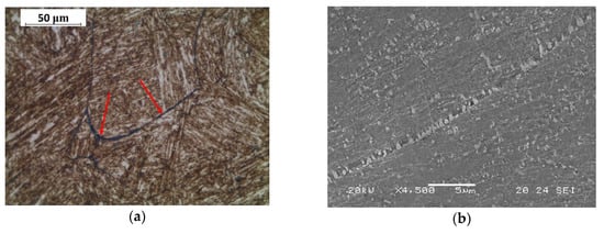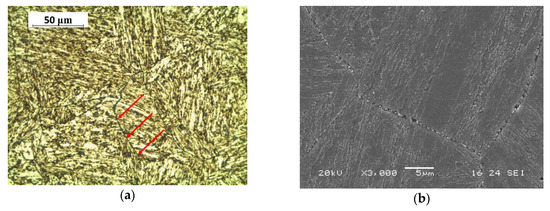(a) Light microscope image (red arrows indicate carbides) and (b) SEM image of group X steel microstructure.