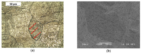 After polishing, Beraha CdS etching was used for light microscope images. The presence of carbides, highlighted in purple-blue colours by etching, was evident for all treatment conditions. They were principally precipitated in correspondence with grain boundaries and are indicated by the red arrows in the figures (Figure 1a, Figure 2a and Figure 3a), while SEM images (Figure 1b, Figure 2b and Figure 3b) reported precipitated details with a higher magnification. Metallographic analysis showed a grain size within the range of 50–150 μm.