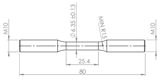 Mechanical testing was carried out on as-received samples to determine the reference behaviour of each treatment condition after hydrogen charging by means of MTS CERT machine 647 All-temperature Hydraulic Wedge Grips (equipped with dedicated autoclave). The samples’ geometry was in agreement with NACE TM0177 and dedicated threaded gripping ends were machined (Figure 4). Tests were performed with reference to NACE TM0198 and ASTM G129 [20,21], and charging methods are reported in Section 2.3.1.