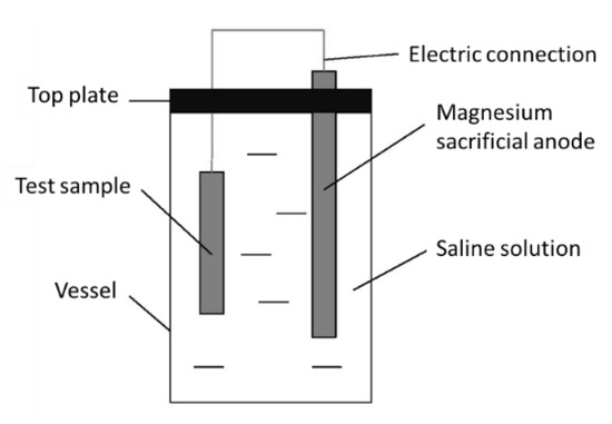 Some samples were subjected to mechanical testing after electrochemical hydrogen charging in a cathodic protection condition (scheme reported in Figure 5), simulating subsea applications. Test specimens were electrically connected to a magnesium sacrificial anode in a saline solution (3.5% NaCl). The electrochemical potential difference between Mg and stainless steel gives rise to a current, because of the galvanic corrosion setup. The voltage between the anode and the cathode of the galvanic coupling was measured by means of a reference electrode and corresponded to 1.96 V. The test temperature varied from room temperature to 60 °C by means of a thermostatic bath.