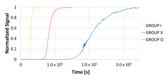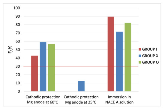 In Figure 7, embrittlement indexes determined on the samples’ elongation at break, as described in Equation (2), were correlated to the hydrogen charging method to compare the behaviour of groups I, X and O.