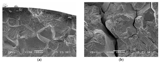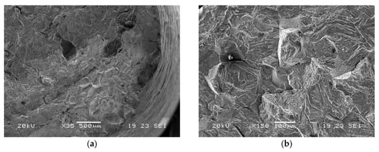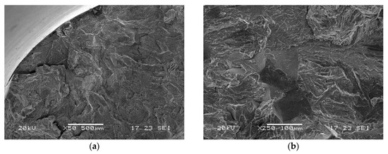 Considering the test conditions described in dedicated standard references, with the sample immersed in NACE A solution, fracture surfaces were observed by a scanning electron microscope to evaluate the main fracture mode. Images related to all three material groups are reported in Figure 8, Figure 9 and Figure 10.