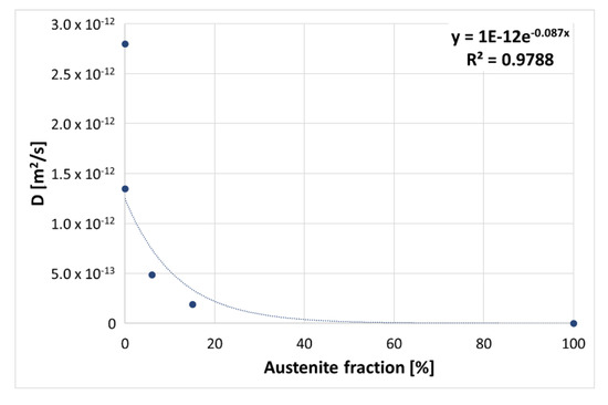 Exponential regression of the hydrogen diffusion coefficient as a function of the austenitic phase fraction.