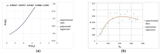Example of (a) true stress-true strain plastic range up to necking initiation in a bi-logarithmic diagram and regression with fourth degree polynomial, (b) instantaneous strain hardening coefficient comparison between experimental data and polynomial regression on group X.