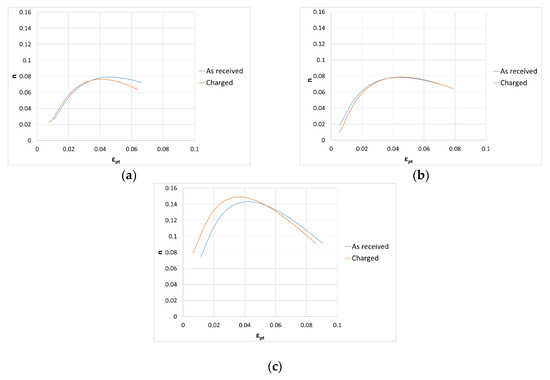 Instantaneous strain hardening coefficient as a function of plastic strain. Comparison between as-received material and after hydrogen charging under Mg cathodic protection at 60 °C for (a) group I, (b) group X and (c) group O.